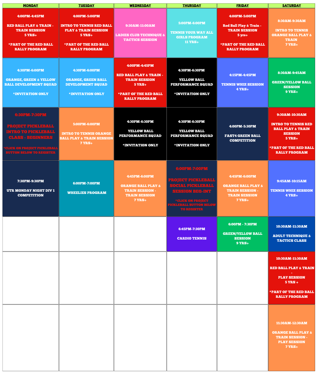 TEAM RSTA PROGRAM SCHEDULE@North Woden TC Proudly Supported by ENQUIRIES ENQUIRE ABOUT A FREE TRIAL COACHING & SCHOOL HOLIDAY PROGRAMS Junior Tennis Programs School Holiday Tennis Programs Adult Tennis Lessons UTR & Fast4 Tennis Competitions PICKLEBALL Project Pickleball Court Hire & Session Bookings BOOK A COURT @ NORTH WODEN TC Book A Tennis Court PAY AN INVOICE RSTA - ACT RSTA - NSW NWTC MEMBERSHIP North Woden Tennis Club Membership COACHING VENUES North Woden Tennis Club Bungendore Park Tennis Club Braidwood Tennis Club Terms and Conditions